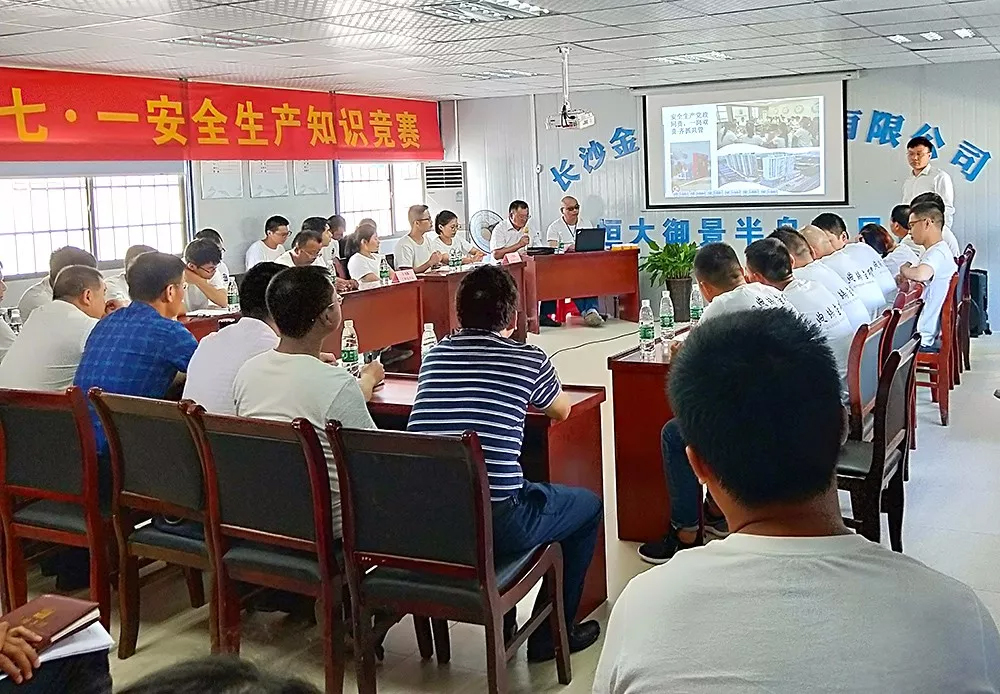 為進一步延伸“安全生產(chǎn)月”活動,全面貫徹黨的十九大精神,積極響應(yīng)習(xí)近平總書記對安全工作的重要指示和省、市關(guān)于安全生產(chǎn)的決策部署,在公司掀起安全生產(chǎn)學(xué)習(xí)熱潮,營造濃厚的安全生產(chǎn)氛圍。在建黨97周年之際,公司安全生產(chǎn)月活動之時,以公司黨員帶領(lǐng)全體員工開展以“生命至上、安全發(fā)展”為主題的安全生產(chǎn)知識競賽在恒大御景半島項目部會議室隆重舉行。